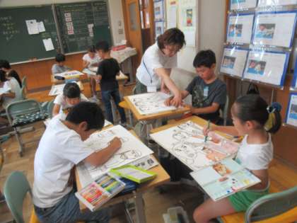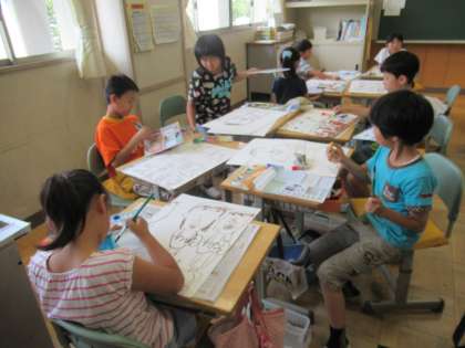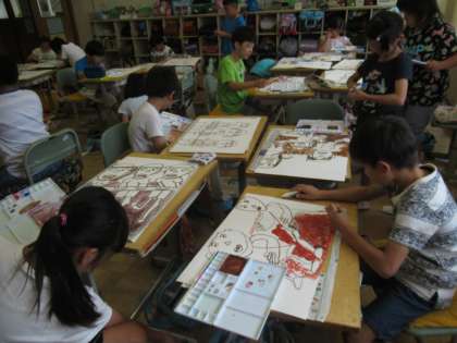 運動会の絵を描いています。迫力満点のすてきな絵が進行中です。