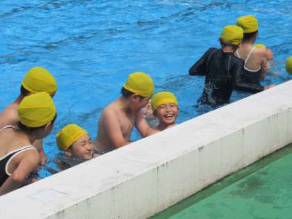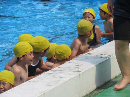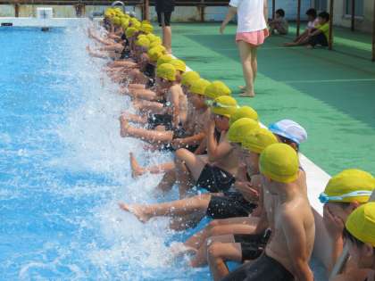 プールサイドに腰掛けて、体を水に慣らします。さあ、お待ちかねのプールに入りましょう。