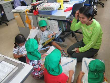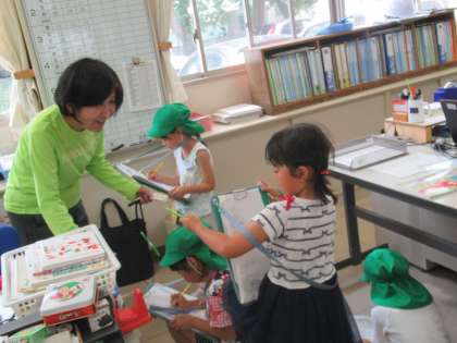 なかよし班の先生を見つけて、インタビューをしています。何を質問しているのかな?