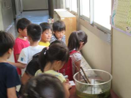 今朝、1年生の廊下に人だかりが…。プールで捕獲したヤゴが、羽化しているところでした。小さな命の営みを目の当たりにして、大興奮の子どもたちでした。
