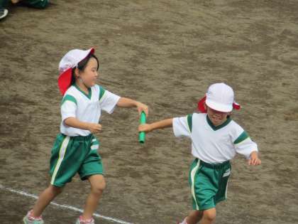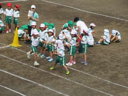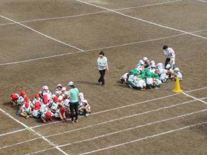 2クラスが一緒に、リレーの練習をしています。