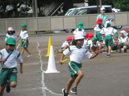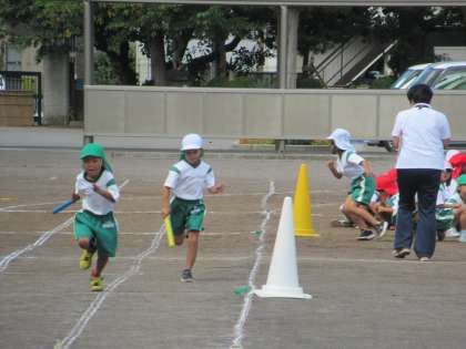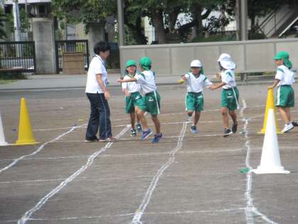 2クラスが一緒に、リレーの練習をしています。走りっぷりが、たくましくなってきました。