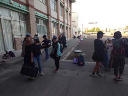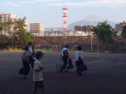 集合時刻が近づいてきました。よく晴れた空の下、6年生が続々と集まってきます。
