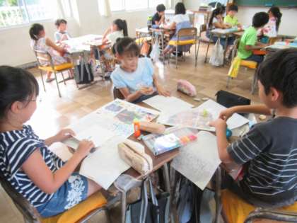 まちたんけんの成果を、新聞にまとめています。写真を使ったりクイズを入れたり、工夫しています。