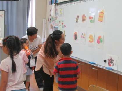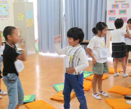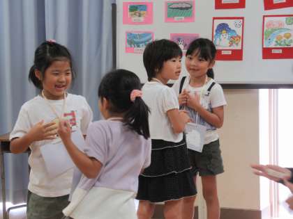 友だちと、英語でジャンケンをして、お菓子のカードをやり取りするゲームをしています。ALTの先生とも、英語でやり取りをします。