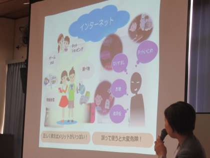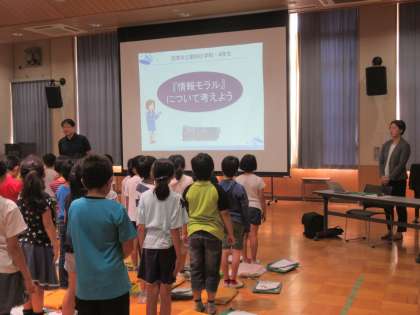 これは、情報モラルについて学習し、便利ではあるけれど危険もはらんでいるネットの使い方を考え、自分の身を守るための知識と力をつける教室です。3時間目は、4年生が学習しています。