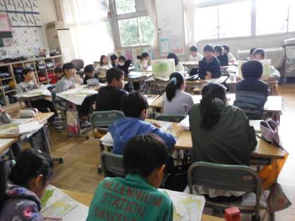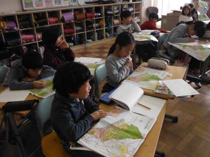3年生は、沼津市の学習をしています。沼津市の地図で、市内の様子を確認していました。