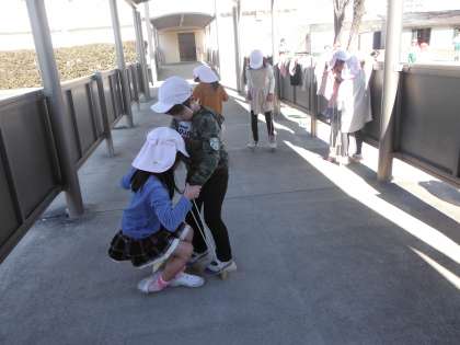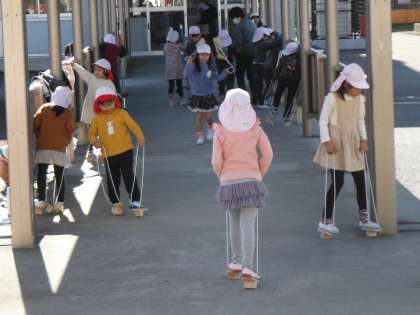 「ふゆのあそび」と題して、みんなで遊んでいます。ぽっくりは、すぐにバランスが取れるようになりました。