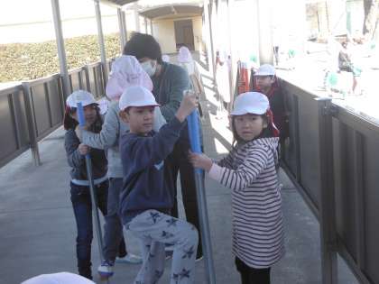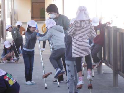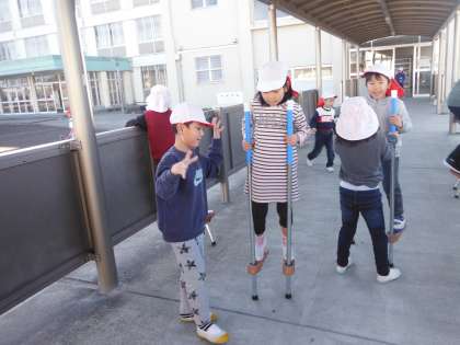 「ふゆのあそび」と題して、みんなで遊んでいます。竹馬は、お友だちと助け合って練習します。「あっ、乗れた!」