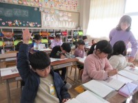 使い方を学んできたトライアングル、タンブリン、鈴、ウッドブロック、鉄琴の音を組み合わせて、星空の音楽を作っています。楽器もたたき方も3〜4人の小グループで相談しながら、星が光り始める夕方、星が輝く真夜中、星が見えなくなっていく明け方の表現の仕方を考えています。