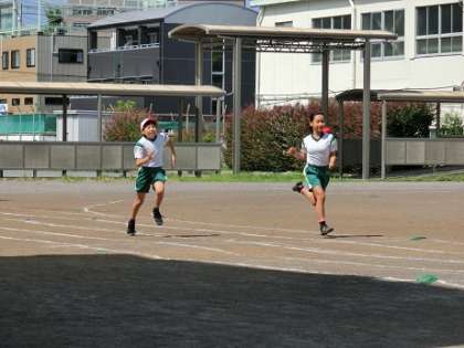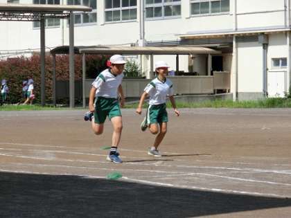 今日は、5年2組が運動場で50mのタイムを計測していました。