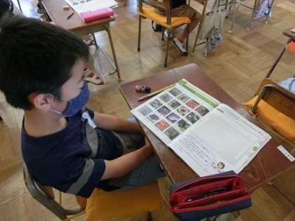 2組の子たちは、読解の時間で、教科書に載っている生き物写真をどのように仲間分けして、整理したらいいのかを考えようとしています。