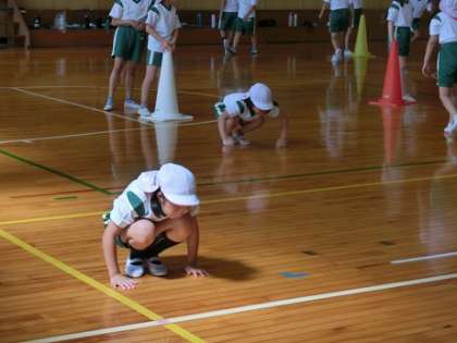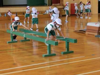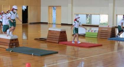 3年生が体育館で、跳び箱、平均台などを組み合わせてサーキッド運動に取り組んでいました。「手、足、手、足」と交互にリズムよく動いたり、跳び箱をきれいに跳び越すことに挑戦したりして、何周も運動に取り組んでいました。