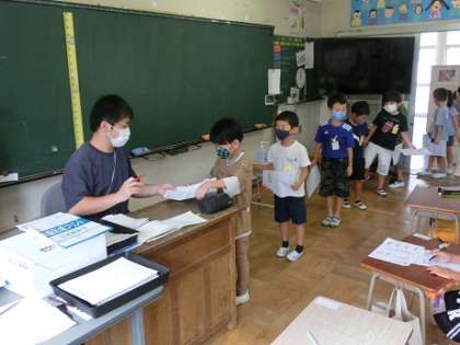 1年生が10より大きい数の学習をしています。2組は、問題のプリントをやった後、一人一人先生に見てもらっています。待っている人たちが前の人との距離に気をつけて待っていました。子供たちは、自分たちでも感染予防に努めています。