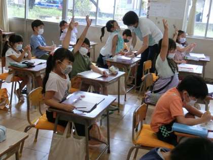1組の子たちは、教科書の練習問題をやった後、手を挙げて発表していました。