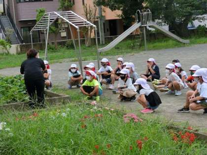 3年3組の理科です。花壇の前で、先生の話をしっかり聞いた後、生き物のすみか探し、観察に出かけました。「あっここにありの巣がある」と早速ありのすみかを見つけ、Chromebookで写真を撮る子たちもいました。