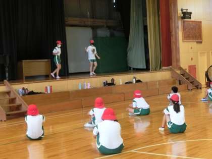 6年1組の体育では、ダンスリーダーの子たちが前に出て、体育学習発表会のダンスの振りをみんなに教えています。まずは、ボックスステップから、みんなで取り組んでいました。2組は、6時間め、漢字ドリルを真剣にやっています。