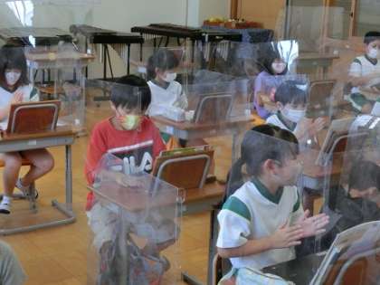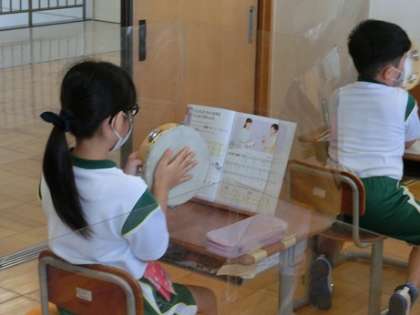 2年3組の子たちは、2拍子のリズムに挑戦です。「この空とぼく」の曲に合せて、始めは、手拍子で2拍子のリズムをとっていました。手拍子の次は、椅子や、机を叩いたり、足を踏みならしたりして、2拍子のリズムを表しましt。最後は、タンブリンでリズムをとっています。