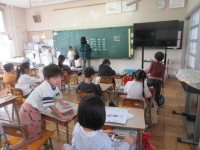 先生に投げかけられた「何時何分」を、手にもった時計で表しています。先生がテレビの画面で、時計の針をグルグルッと動かすと、「食べるのはどこ」の授業です。「妖怪ウォッチみたいだ」と時計の針の動きに注目する子もいました。