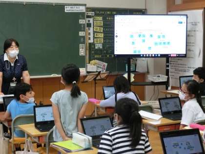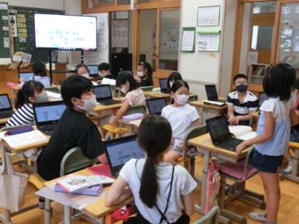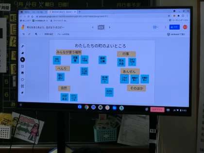 3年3組では、国語の学習で、自分たちの町のよいところを出し合っています。市民プール、児童館、スポーツ広場、おいしい水など、町のよいところをChromebookのジャムボードの付箋に書き込んだ後、みんなで使う場所、便利、自然、安全、行事などをカテゴリーにしてみんなで意見を整理していました。子供たちの考えがズレたのは、おいしい水は、安全のカテゴリーに入れるのか、それとも便利のカテゴリーに入れるのかです。それぞれの考えの子が、その理由をしっかり発言していました。