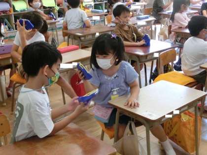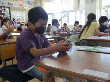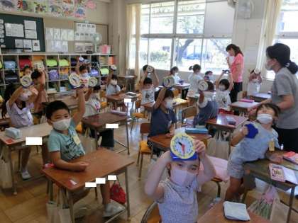 1年生が時計の学習をしています。先生に言われた時刻を長い針と短い針に気をつけながら表します。1組の子たちは、「沼津のチャイムが鳴る時間は?」と問題を出され、「12時〜」と答えながら、時計を操作していました。腕に時計をはめて、腕時計のようにしている子もいます。2組の子は、表した時間が合っているか、近くの子同士でお互いに確認していました。1組の子は手を元気よく上に上げて、先生に見せていました。