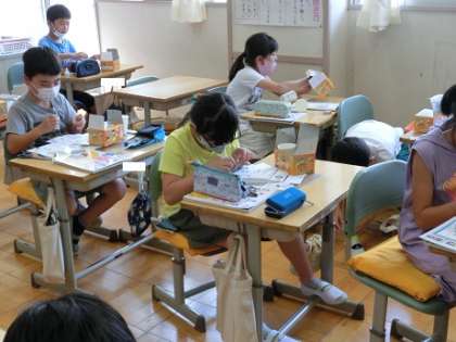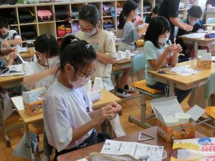 3年3組では、音のふしぎを学習します。これから音を出して気づいたことを出し合っていくため、トライアングルや輪ゴムギターなど自分が実験に使う道具を準備していました。説明書を見てもやり方がわからないところは、近くの友達に聞いています。