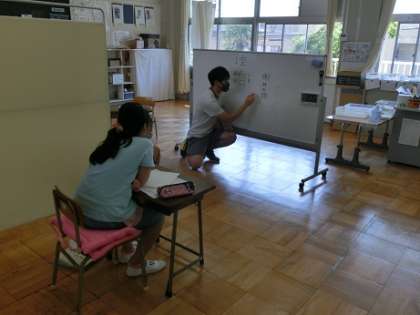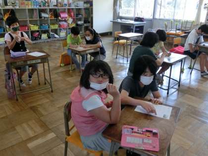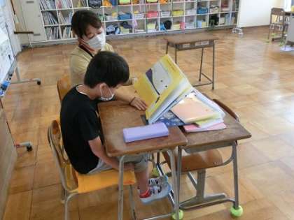 7−3組では「休日」や「休けい」など、「休」のつく言葉とその意味を学習していました。2組では先生が「しんかんせんうちにくる」の絵本の読み聞かせしながら、質問したり答えたりしていました。