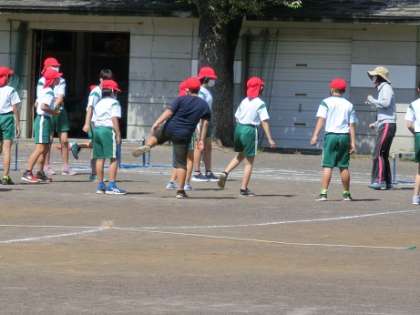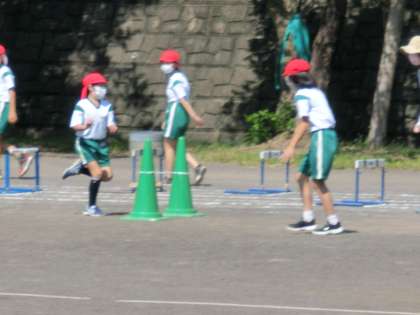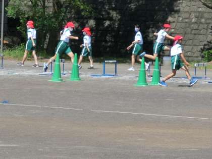 5年1組の子たちは、先週に引き続き、ハードル走の学習です。全体で「ぬき足」について確認した後、練習に入りました。ゴムを使ったコースでは、トントントンというリズムで跳び越せるように練習している子もいました。