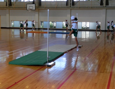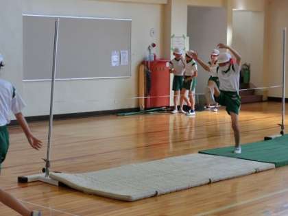 5年2組は、体育館で走り高跳びの学習です。ゴムを跳び越す時の前の足と跳び越した後の後ろ足を意識しながら跳躍しています。