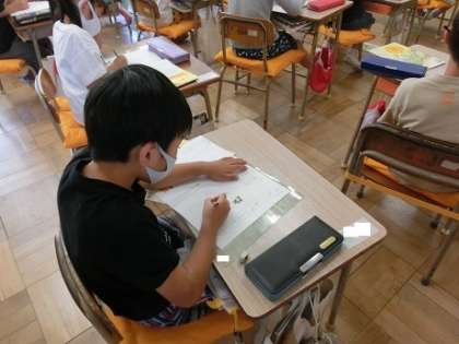 1年2組では、書写の時間です。「いかのおすじ」など、ひらがなの練習を行っています。