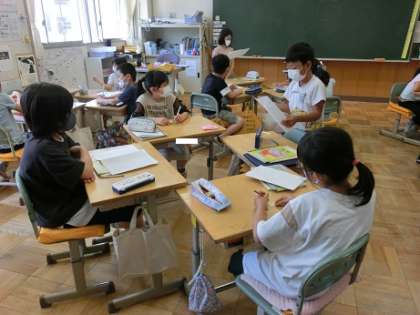 3年1組の教室では、先日、友達に伝えたいことをテーマに書いた作文をお互いに発表し合っています。聞いた後は、付箋に気がついたことや感想などを書いて、渡していました。