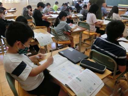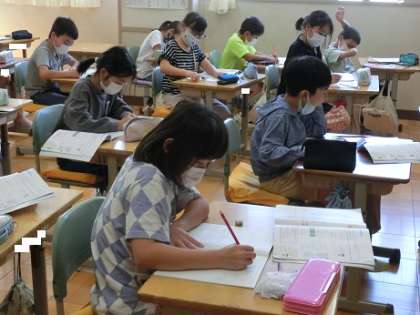 3年3組では、算数のかけ算の筆算の学習のまとめとして、練習問題に取り組んでいます。