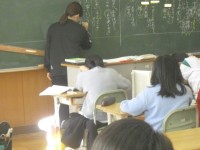 5年1組の外国語の時間です。黒板に貼られた単語を使って、おかしの紹介を考えました。