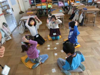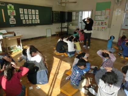 2年1組では、英語の学習でカルタをやっていました。Wnat animal do you like ? I like ○○と動物の名前を先生が言い、床に置いた動物のカードを取り合っていました。