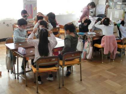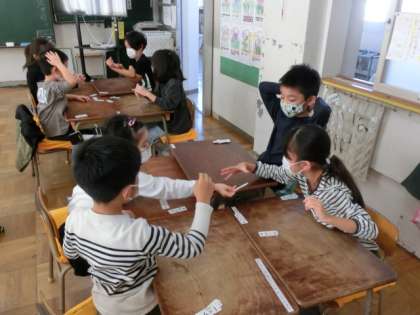 2年2組は、かけ算九九の学習でカルタです。先生が言った数のかけ算九九の式が書かれたカードをみんなで取り合っていました。