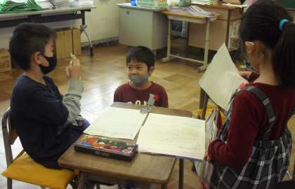 2年1組の国語「作ってあそぼう」では、手作りおもちゃの説明を考えていました。同じおもちゃのグループを作り、できた説明を読み合いながら、よりわかりやすくなるように話し合っていました。