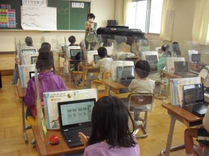 2年3組の音楽では、太鼓のリズムを考えていました。Chromebookを使って、リズム譜を組み合わせて、みんな、それぞれのオリジナル演奏ができそうです。