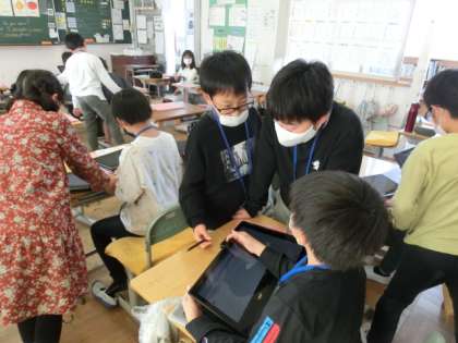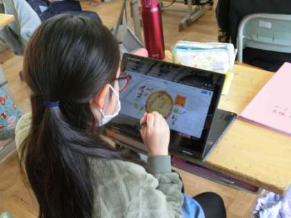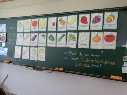 4年2組では、黒板に貼り出された野菜や果物などの具を使って、ピザ作りに取り組んでいました。作った後は、英語を使って紹介するようです。