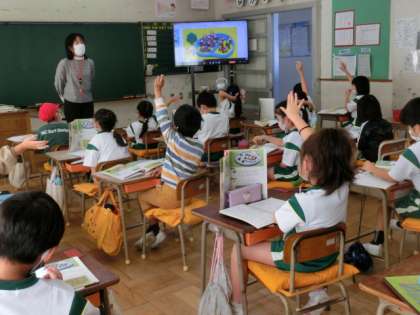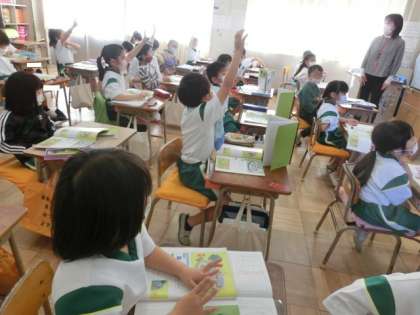 1年生は2時間目に算数の授業でした。1組は、岩にいるさると木にいるさるの絵をもとにして、たし算の式になるのか、引き算の式になるのかを考えていました。