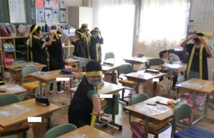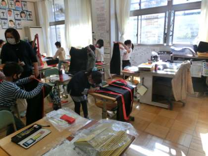 2時間目、3年1組と2組では、体育学習発表会のソーラン節で着るはっぴの衣装合わせをしていました。はちまきをぎゅっと締めると、気持ちも引き締まったようで、気合いが入っています。