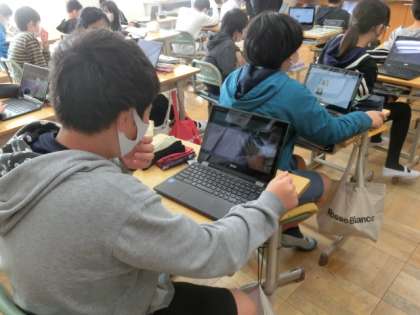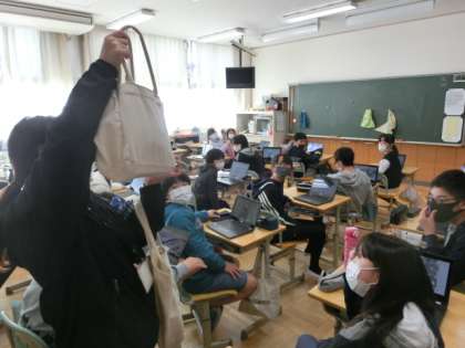 6年2組は、修学旅行に持って行くエコバック作りに取り組み始めました。自分たちの持っているバックでイメージを持ち、YouTubeのエコバックの作り方の動画を観て、実際にどのように作っていくのか見通しを持っていました。