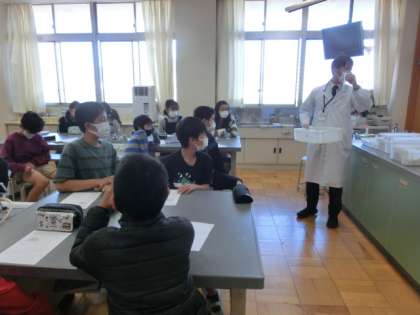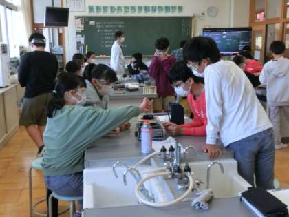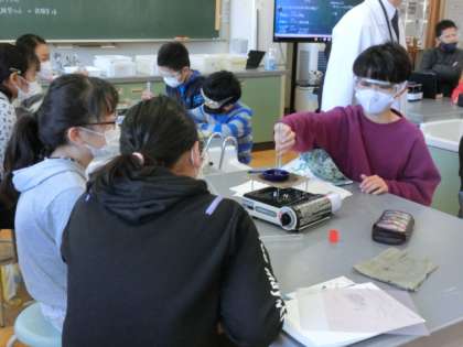 6年1組の子たちは、塩酸にアルミニウムが溶けた水溶液を蒸発させて、取り出されたものについて調べる実験を始めていました。ガスコンロにガスボンベを取り付け、慎重に火をつけていました。