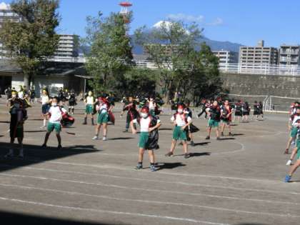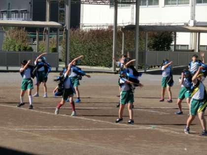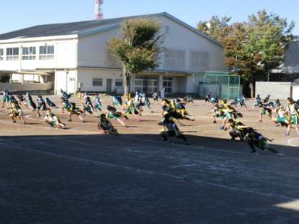4時間目、3,4年生が運動場でソーラン節の練習です。今日は、はっぴを着て、はちまきを締めての練習でしたが、強い風がはっぴを揺らし、踊りにくそうでした。