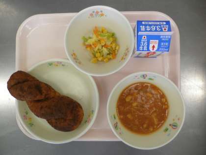 今日のメニューは、ココア揚げパン・牛乳・ポークビーンズ・キャベツのソテーです。今日のココア揚げパンは、リクエストメニューでした。揚げパンは、高温の油で30秒ぐらい揚げて、その後すぐにココアと砂糖をまぶします。