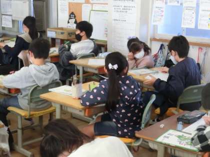 4年2組では、もみじの歌詞の表す情景を想像し、旋律の重なり方に気づいて、歌唱していました。