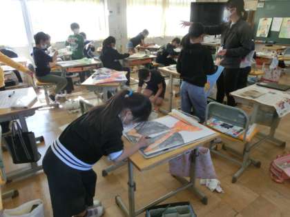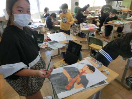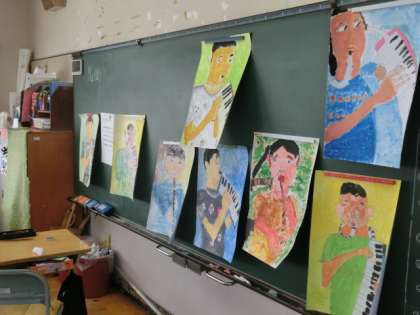 4年3組では、楽器を演奏する友達の絵を仕上げていました。