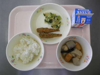 今日の給食は、ごはん・牛乳・煮込みおでん・小いわし磯辺フライ・ほうれんそうとキャベツのごま和えです。今日は、寒い時期にぴったりの煮込みおでんです。今日のおでんには、大中寺いもを使っています。大中寺いもは、沼津市名産の伝統野菜で、赤ちゃんの頭ほどの大きさがあり、とても大きなさといもです。