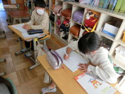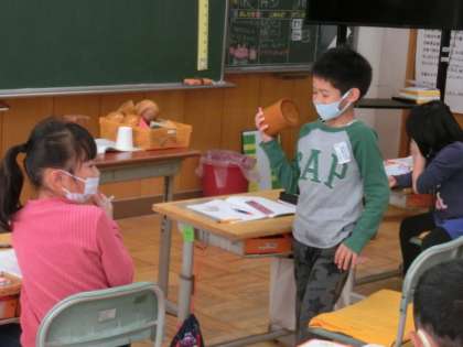 3年1組、5時間目、算数です。真上や真横など、いろいろなところからものを観たときにどんな形をしているのか、まずは頭の中にその図形を思い浮かべて、考えていました。