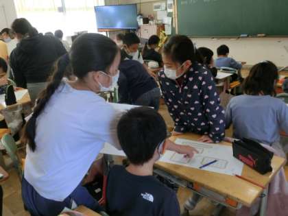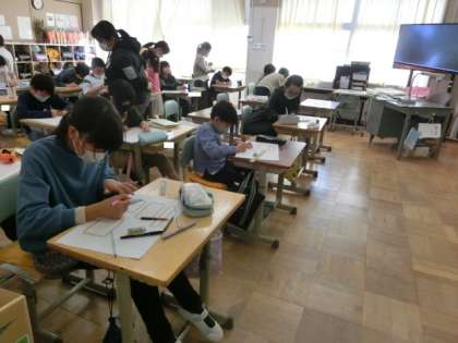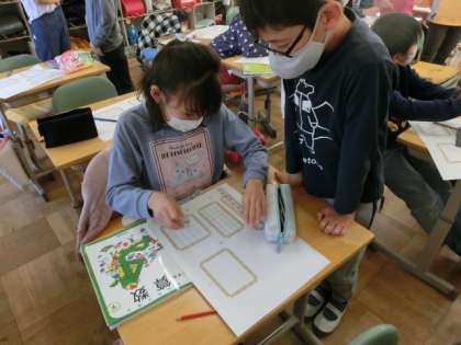 5時間目、4年1組の子たちは、レンガで囲まれた広さをどのように比べたらいいのか、考えていました。友達の考えを積極的に聴きに行き、新たな考えを見つけている子もいました。