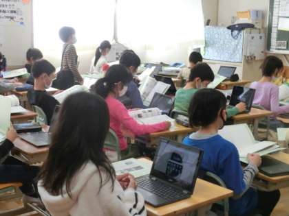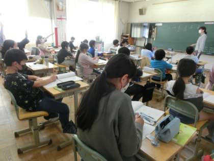 5時間目、5年1組では、分数を小数や整数に変換して、数の大小を決めていました。